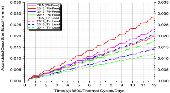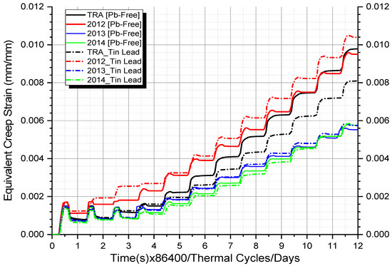Figure 12 shows that, for up to the third thermal cycle, the accumulated creep strain damage response in the Pb-free solder interconnection remained largely unchanged for the 2013, 2014 and TRA cycles.