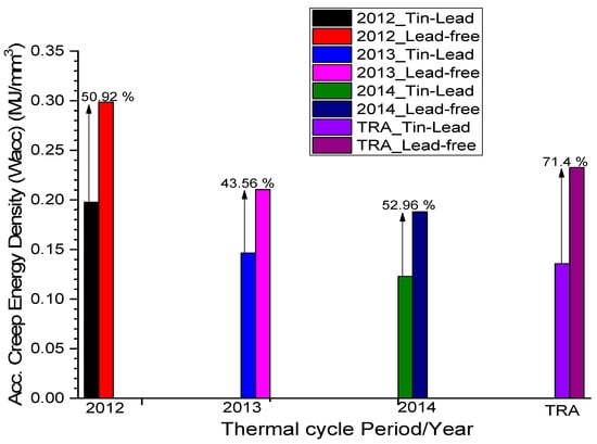 Table 7 presents a summary of the percentage change in accumulated creep strain from the SnPb solder interconnection to the Pb-free solder interconnection. It was observed that for the 2012, 2013 and 2014 thermal cycles, the accumulated creep strain damage increases by an average value of 45% when the interconnection solder is changed from an SnPb solder to Pb-free solder. However, the increase in accumulated creep strain was lower than the 57.96% increase resulting from the TRA cycle. The value of 57.96% must be the true value for the test region since it uses the average of the temperature load data from 2012–2014, as previously indicated.
