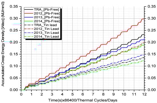 Figure 14 shows the time-dependent cumulative creep energy density for the two separate solder interconnection materials over various thermal cycle profiles. The accumulated creep energy density profiles for 2013 and TRA thermal cycles remained roughly similar for up to six thermal cycles with the Pb-free solder interconnection, as shown in