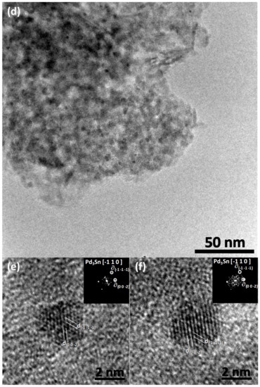 HRTEM images of nanoparticles from 3Pd1Sn/γ-Al2O3 are presented in Figure 1e,f. Both nanoparticles are oriented in a <1 1 0> type direction. As previously, we have arbitrarily chosen the Pd3Sn [−1 1 0] giving rise to visible interplanar distances d(0 0 −2) and d(−1 −1 −1); the third interplanar distance was either absent or very faint to provide a proper measurement. The measurements of the nanoparticle in Figure 1e show d(0 0 −2) (0.203 ± 0.05 nm) and d(−1 −1 −1) (0.231 ± 0.05 nm) separated by a 54.3 ± 0.5° angle. For the nanoparticle in Figure 1f, we have measured d(0 0 −2) (0.201 ± 0.05 nm) and d(−1 −1 −1) (0.232 ± 0.05 nm) separated by a 54.5 ± 0.5° angle. These numerical values correspond to the expected ones for Pd3Sn (PDF: PDF: 03-065-8225; d(0 0 −2) (0.1984 nm) and d(−1 −1 −1) (0.2290 nm) separated by a 57.74° angle) within the precision of the measure. However, it is difficult to state that these results confirm that the nanoparticles are bimetallic since, for the observed orientations the interplanar distances for fcc Pd and for bcc Pd3Sn are equivalent and very close if we take into account the precision of the measure.
