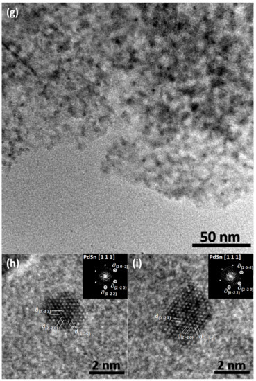 Finally, for sample1Pd1Sn/γ-Al2O3, we noticed that for both nanoparticles presented in Figure 1h,i, we had three similar interplanar distances separated ≈60° angles. This is possible either for the [1] orientation in hcp structures of for the [1 1 1] orientation in fcc structures. We have thus dismissed the proposed orthorhombic structure (PDF: 00-004-0803). With no other possibility to our knowledge in literature, we have thus decided to use a fcc structure with a lattice parameter a = 0.519 nm derived from the Vegard law for a PdSn stoichiometry (experimentally confirmed by EDX) based on the linear combination of parameters of Pd fcc Fm-3m (PDF: 00-046-1043; a = 0.3890 nm)) and α-Sn fcc diamond-like (PDF: 01-086-2266; a = 0.6489 nm) structures. We have thus two nanoparticles oriented in the [1 1 1] direction with visible interplanar distances d(0 −2 2), d(2 −2 0) and d(2 0 −2). For nanoparticle in Figure 1h we have d(0 −2 2) (0.184 ± 0.05 nm), d(2 −2 0) (0.185 ± 0.05 nm) and d(2 0 −2) (0.184 ± 0.05 nm), separated, respectively, by 60.4 ± 0.5° and 59.8 ± 0.5°. For the nanoparticle in Figure 1i we obtained d(0 −2 2) (0.185 ± 0.05 nm), d(2 −2 0) (0.186 ± 0.05 nm) and d(2 0 −2) (0.181 ± 0.05 nm), separated, respectively, by 59.9 ± 0.5° and 60.2 ± 0.5°. This is in excellent agreement with the expected value (0.184 nm) for d(0 −2 2), d(2 −2 0) and d(2 0−2), which are separated by 60° angles. This confirms thus that our assumption to use a fcc structure for PdSn based on the Vegard law and fcc Pd and Sn is an appropriate solution, despite lacking from formal evidence. This also confirms, if needed, the EDX results showing that the nanoparticles are bimetallic.