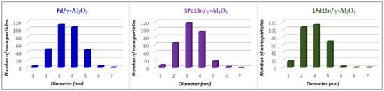 Nanoparticle size histograms for Pd/γ-Al2O3 (blue, left); 3Pd1Sn/γ-Al2O3 (violet, center) and 1Pd1Sn/γ-Al2O3 (green, right).