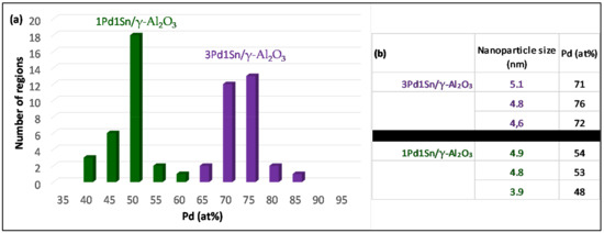 (a) Pd content (at%; Sn content is the complement to 100%) measured by EDX (on regions of 5–10 nanoparticles for 3Pd1Sn/γ-Al2O3 (violet) and 1Pd1Sn/γ-Al2O3 (green). (b) Pd content (at%) measured by EDX on few large (size is given) individual nanoparticles for 3Pd1Sn/γ-Al2O3 and 1Pd1Sn/γ-Al2O3.