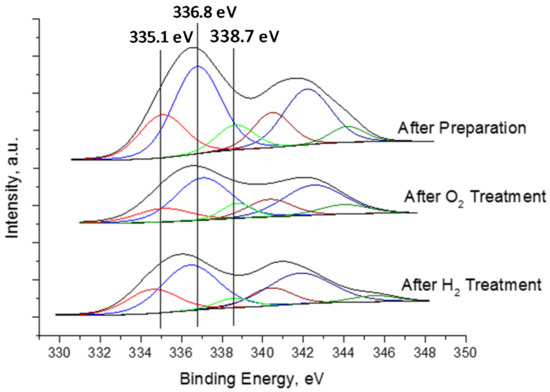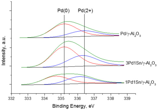 The XPS Pd 3d5/2-Pd 3d3/2 spectra shown in Figure 8 for 1Pd1Sn/γ-Al2O3 sample correspond to three states: after preparation procedure (deposition of the metallic precursors on the γ-Al2O3 surface), after oxidation under O2 and after reduction under H2. These spectra can be decomposed in three contributions with binding energy Pd 3d5/2 = 335.1 and 336.8 eV, corresponding to palladium in the reduced Pd(0) and oxidized Pd(2+) states in PdO, with a prevalence of the second one; and a contribution with a larger value for the binding energy Pd 3d5/2 = 338.7 eV which is in perfect agreement with the formation of palladium–aluminate structures [78]. The evolution of the three contributions is consistent with the successive (oxidation and reduction) treatments after preparation.