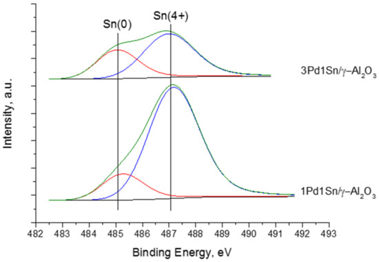 The deconvoluted XPS spectra of Sn3d5/2 core-level for 3Pd1Sn/γ-Al2O3 and 1Pd1Sn/γ-Al2O3 are shown in Figure 5 and the (semi-)quantitative data extracted from these spectra are presented in Table 2. Both bimetallic samples demonstrate two similar components of tin species. The higher binding energy (487.0–487.2 eV) can be related to tin oxide remaining even if the samples were reduced in hydrogen flow at 500 °C for 2 h. This is often the case due to (very) small unavoidable amounts of oxygen dead volume present in the vacuum locks during sample transfer and to the high propensity of Sn to oxidize. The higher binding energy (487.0–487.2 eV) can be related to tin oxide remaining even if the samples were reduced in hydrogen flow at 500 °C for 2 h. This observation together with the fact that part of tin is reduced simultaneously with palladium by TPR-H2 suggests, as will be shown below, that the remaining unreduced tin is within the bimetallic nanoparticles. On the other hand, the remaining portion of tin component observed at the lower binding energy in the range 485.1–485.3 eV can be assigned to the presence of palladium-tin alloy [80]. It can be seen also that with the addition of tin the amount of palladium (II) oxide increases for bimetallic Pd-Sn samples.