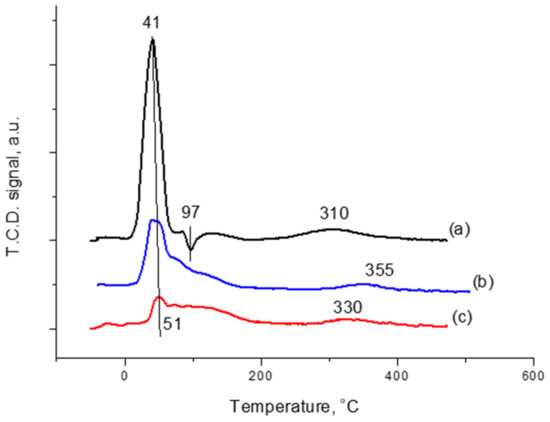 TPR profiles of synthesized samples: (a) Pd/γ-Al2O3, (b) 3Pd1Sn/γ-Al2O3 and (c) 1Pd1Sn/γ-Al2O3.