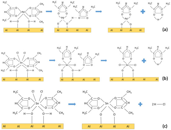 It has been reported that the Sn(acac)2Cl2 complex reacts with coordination unsaturated Al3+ ions on the surface of the γ-Al2O3 support [90,91]. It is assumed that the reaction between Sn(acac)2Cl2 and coordination-unsaturated Al3+ ions leads to the formation of particles [Sn(acac)+Cl2]s and [Al(acac)]2+s on the γ-Al2O3 surface. In the proposed reaction mechanism, the Sn(acac)2Cl2 complex gives an acetylacetonate ligand with the formation of a substituted complex Sn(acac)+Cl2 and surface-adsorbed aluminum acetylacetonate Al(acac)2+s. It is noted that the formation of SnCl2 is unlikely, since it is expected that Sn(acac)2Cl2 will react with Al3+ to form Sn(acac)+Cl2 and surface adsorbed aluminum acetylacetonate Al(acac)2+s until the number of coordination unsaturated ions Al3+ will not be exhausted [90,91].