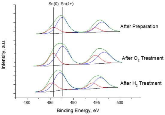 To better understand the contribution of different states, the XPS spectra of Sn 3d were deconvolved. In Figure 9 shows the XPS spectra of Sn 3d3/2 and the Sn 3d5/2 signal that can be decomposed into two symmetrical peaks, as shown in Figure 9. XPS spectra of the Sn 3d5/2 after preparation procedure (deposition of the metallic precursors on the γ-Al2O3 surface) of the 1Pd1Sn/γ-Al2O3 sample with the lowest binding energy value corresponds to the Sn (0) state, which can be attributed to metallic tin species (Sn 3d5/2 = 485.8 eV). The peak with the highest binding energy belongs to oxidized Sn (4+) species [106,107], which could be contained adsorbed tin complex (Sn 3d5/2 = 487.6 eV) [97]. After its strong chemisorption Sn(acac)2]Cl2 precursor on the γ-Al2O3 surface and the oxidation treatment in O2 atmosphere at 350 °C for 2 h of the adsorbed tin complex on the γ-Al2O3 surface completely oxidizes the residual acac ligands and lead to the formation of the SnO2 species (Sn 3d5/2 = 487.7 eV) [108]. The peak position with the binding energy 485.7 eV (Sn 3d5/2) corresponds to Sn (0) state which can be attributed to the metallic tin species [109,110]. After the reduction in H2 atmosphere at 500 °C for 2 h the peak position with binding energy Sn 3d5/2 485.6 eV were ascribed to metallic Sn and the binding energy of Sn 3d5/2 (487.3 eV) indicated that Sn was in the Sn(+4) oxidation state in the form SnO2 [109,110]. However, the binding energies of Sn 3d5/2 is slightly lower for Sn(4+) oxidation state (487.1 eV) than for oxidized sample (487.6 eV) and for Sn(0) state (485.3 eV) than for oxidized sample (485.7 eV), respectively, which could be assigned to the presence of the bimetallic Pd-Sn species [24,84].