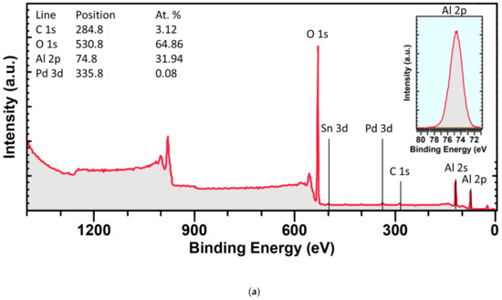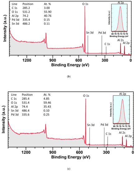 The elemental composition of the surface and near-surface layers (the depth of XPS analysis is tens of angstroms) of the initial monometallic Pd/γ-Al2O3 sample and bimetallic Pd-Sn samples can be observed from the overview XPS spectrum shown in Figure 10a–c. With the exception of tin lines, lines of basic elements such as aluminum and oxygen, carbon and palladium are found in all the survey spectra presented. Presented also are the atomic fractions (%) of C, Al, O, Pd and Sn, determined from the intensities of the corresponding XPS lines at the core-level (C 1s, Al 2p, O 1s, Pd 3d, Sn 3d) corrected for the atomic sensitivity coefficients (ASF) [97]. It is seen that the carbon content in the samples is in the range of 3–5 at.% and has a maximum for the 1Pd1Sn/γ-Al2O3 sample (4.85 at.%). As a rule, carbon impurities have a dual origin; it can be introduced both at the stage of sample preparation and as a result of adsorption of hydrocarbons during evacuation of a sample inside an electronic spectrometer. Evaluation of Al chemical states after reduction at 500°C in H2 are shown in Figure 9. It can be seen that, in full agreement with the quantitative data, the surface Al concentration increases in the following order: Pd/γ-Al2O3 < 1Pd1Sn/γ-Al2O3 < 3PdSn/γ-Al2O3. The maximum surface concentration of aluminum is observed for the 3PdSn/γ-Al2O3 sample. This increase in the aluminum content is accompanied by a change in the binding energies of Al 2p, which decreases in the order Pd/γ-Al2O3 > 1Pd1Sn/γ-Al2O3 > 3PdSn/γ-Al2O3. Despite the difference in binding energies by 1 eV, all the observed features can be attributed to Al3+ cations bound to oxygen [111], and variations in the binding energy are explained by changes in the coordination of aluminum and/or structural defects.