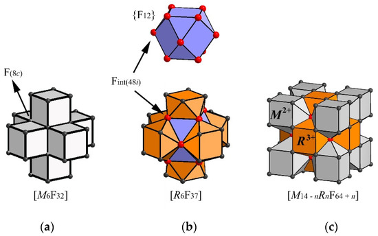 According to the modern concept about the structure of nonstoichiometric fluorite phases M1−xRxF2+x, the defects formed as a result of heterovalent isomorphic replacement of M2+ cations by R3+ cations are grouped into clusters. The anion core of the clusters consists of interstitial anions. According to the principle of local charge compensation, the impurity cations R3+ are located around the anion core to form cation–anion clusters [2,3,4,5].