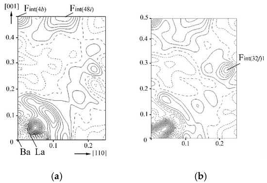 The difference Fourier electron density maps for as-grown and annealed Ba0.69La0.31F2.31 single crystals in the (110) plane are shown in Figure 3. The solid, dotted and long dashed lines in the maps indicate, respectively, positive, negative and zero electron densities. The coordinate grid is given in unit cell fractions. Differences were obtained by subtracting the contributions of ions, Ba2+ and La3+ cations, which share the 4a site in the structure, and matrix anions F(8c) occupying the Wyckoff position 8c with refined site occupancy. All atomic displacement parameters were refined in the harmonic approximation.