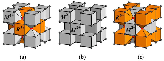 The presence of vacancies in the main anionic motif and interstitial anions in one or more positions is considered to be evidence of cluster formation in the disordered M1−xRxF2+x phases. The cuboctahedral groups {F12} formed by fluorine anions in Wyckoff site 48i (sp. gr. ) are cores of cation–anion octacubic clusters [M14−nRnF64+n] (Figure 1). The study of the cluster structure based on data on interstitial anions is associated with methodological difficulties in determining light fluorine anions against the background of heavy barium and rare earth cations. The accuracy of determining the occupancies of the positions occupied by the interstitial anions in the M1−xRxF2+x structure is quite low.