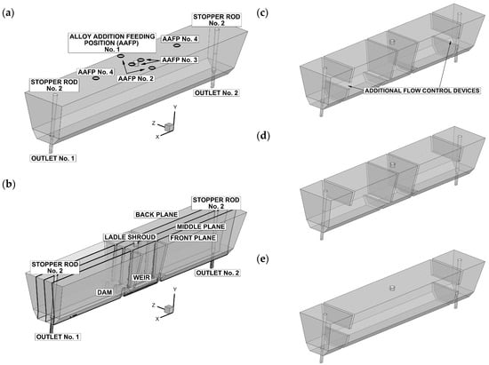 Two-strand slab tundish: (a) alloy addition feeding position, (b) tundish with flow control devices, (c) tundish with additional dams/weirs, (d) tundish with additional weirs, and (e) tundish with dams/weirs only in the zones of stopper rod system.