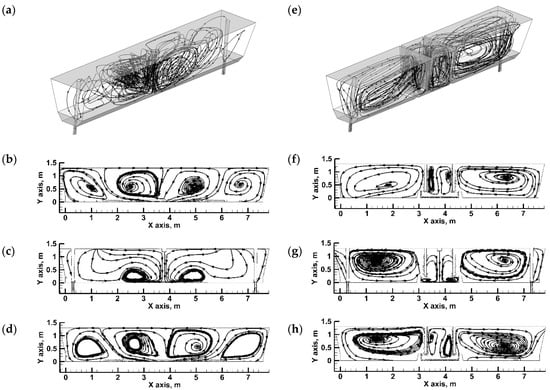 Liquid steel flow path lines: (a) bare tundish global view, (b) longitudinal front plane in the tundish without FCDs, (c) longitudinal middle plane in the tundish without FCDs, (d) longitudinal back plane in the tundish without FCDs, (e) weirs/dams tundish global view, (f) longitudinal front plane in the tundish with FCDs, (g) longitudinal middle plane in the tundish with FCDs, and (h) longitudinal back plane in the tundish with FCDs.