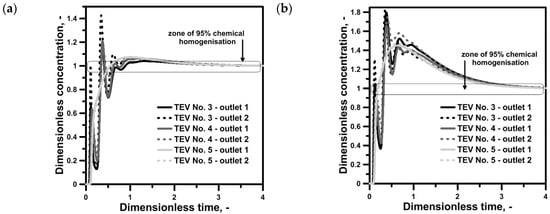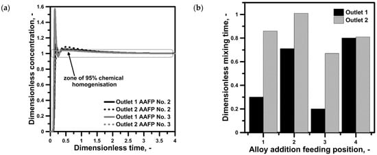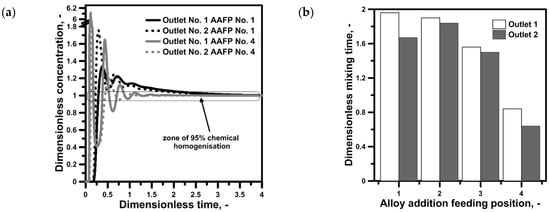 In the next stage of the study for the considered variants of the tundish equipment and alloy addition feeding positions, it was checked how the aluminium would behave in the volume of liquid steel. Figure 5a shows the concentration vs. time curves for tundish equipment variants No. 1 and 2 and alloy addition feeding positions outside the tundish pouring zone. As in the case of nickel, the behaviour of aluminium in liquid steel is also correlated with the tundish equipment. In the tundish with FCDs, the characteristic wave of the mixing curve with gradually decreasing amplitude is visible. In contrast, the mixing of aluminium with liquid steel is definitely weaker than in the case of nickel, as evidenced by the definitely higher concentration of aluminium in the streams flowing through the outlets in the initial period of casting. The majority of the obtained mixing times for aluminium exceeded the value of 2.5 DMT, which, when, casting in 4 DT is 3/5 of the time of casting, which must pass to obtain the required chemical homogenisation level. The obtained mixing times for aluminium at the 3 DMT level concerned only one of the two outlets, while for the second, 95% chemical homogenization level was 2.75 DMT in the bare tundish. Moreover, for aluminium, the shortest mixing time was obtained for AAFP No. 4 and the tundish with FCDs. However, in relation to nickel steel microalloying, introducing the aluminium and obtaining a 95% chemical homogenisation level requires three-fold more time.