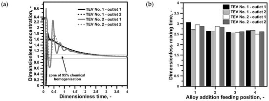 The numerical simulations include diffusivity of nickel or aluminium in the liquid steel. Melting process and shell rising were not considered during numerical simulations. This simplification was verified by continuous slab casting tundish experiments and confirmed quite good consistency between computing and industrial results []. All boundary and initial model conditions were described in the author’s previous works [,,,,,]. Based on the concentration vs. time curves, the dimensionless mixing time (DMT) was calculated. The DMT is defined as the period after which the minimum required liquid steel chemical homogenisation level is maintained, which should amount to at least 95%. The time interval was expressed by dimensionless time, defined by the ratio of the actual time to the average time. The average time for the tundish under examination was 700 s. The previous numerical, physical and industrials studies have confirmed the usefulness of the used numerical model for simulating the macro chemical homogenisation process during steel flow through the tundish [,].