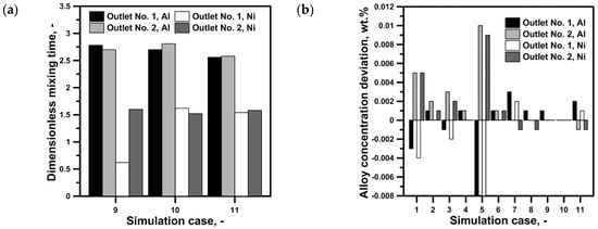 The aim of the next investigations was to check possibility of decreasing dimensionless mixing time in the considered tundish by using other combinations of FCDs. New designs of tundish were performed to evoke some additional recirculation in the liquid steel volume. The average velocity of liquid steel in the liquid steel volume was 0.0504 m/s in the tundish equipment variant No. 5, which was a very similar to value for the bare tundish. In contrast, for TEV Nos. 3–4, liquid steel velocity amounted to 0.0370 m/s. Therefore, the fifth considered tundish equipment variant changed liquid steel flow but did not decrease average velocity. Figure 6 shows concentration vs. time curves for the three following tundish equipment. Concentration vs. time curves for nickel and aluminium characterise symptomatic peaks, especially in the tundish with additional FCDs in the zones near outlets. Quite different concentration vs. time curves for both alloys were obtained for the tundish with FCDs mounted only in the stopper rod system zones. Referring to proposed new tundish design solutions, TEV No. 5 assured the least DMT on the level of value 2.5 for Al and 1.5 for Ni, with very small concentration imbalance at both outlets (Figure 7). A very important problem for liquid steel microalloying is actual alloy concentration obtained at the outlets. Figure 7b presents real alloy concentration deviation in relation to the purpose of microalloying and adjusting the chemical composition of the liquid steel by 0.055 wt%. The highest deviations of alloy concentrations were obtained for AAFP No. 1, while AAFP No. 4 allowed the elimination of deviations or gain value 0.001 %wt. Therefore, for choosing the best tundish equipment and AAFP, not only should DMT be considered but alloy deviations at both outlets, as well.