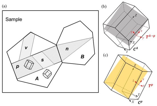 (a) Illustration of twin interactions between grain A and B. Primary twin marked as p in grain A adjacent to the primary twin marked as n in grain B. Another twin variant labeled as v interacts with p within which secondary twin s appears; (b) coordinate systems expressed in the crystal of grain A; (c) coordinate systems expressed in primary twin p.