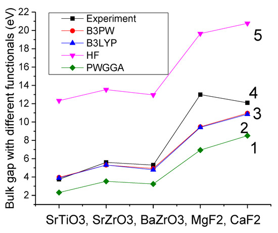 Ab initio calculated and experimentally measured bulk Γ–Γ band gaps for SrTiO3, SrZrO3, BaZrO3, MgF2 and CaF2 obtained by means of different exchange–correlation functionals: (1) PWGGA; (2) B3LYP; (3) B3PW; (4) Experiment; (5) HF.