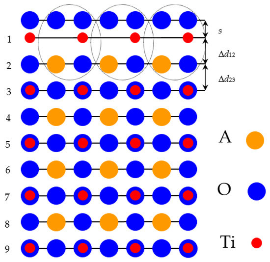 In our ab initio calculations we used WO2-terminated WO3 as well as TiO2-terminated SrTiO3, BaTiO3, PbTiO3 and CaTiO3 (001) slabs containing 9 alternating layers. First our calculated WO3 (001) slab was terminated by WO2 planes from both sides (WO2–O–WO2–O–WO2–O–WO2–O–WO2) from a 19-atom supercell (Figure 2). Another of our calculated SrTiO3, BaTiO3, PbTiO3 and CaTiO3 (001) slabs was terminated by TiO2 planes from both sides (TiO2–AO–TiO2–AO–TiO2–AO–TiO2–AOvTiO2) and consisted of a 23-atom supercell (Figure 3). Both our calculated slabs were non-stoichiometric and had unit-cell equations W5O14 as well as A4Ti5O14, respectively. To analyse the chemical bonds, effective atomic charges and covalency effects for WO3 and ATiO3 perovskite bulk and (001) surfaces, we used the well-known Mulliken population analysis [48,49,50,51,52].