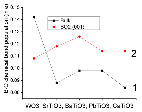 The Ti–O chemical bond population in SrTiO3, BaTiO3, PbTiO3 and CaTiO3 bulk was always smaller than near their TiO2-terminated (001) surface (see Figure 4). In contrast, the W–O chemical bond population in the WO3 bulk (0.142e) was larger than near the WO2-terminated WO3 (001) surface (0.108e). Nevertheless, the largest W–O chemical bond population, according to our ab initio calculations, is between the W atom located on the WO2-terminated WO3 (001) surface and the second-layer O atom (0.278e). It was worth noting, that also for the related material ReO3, according to our calculations [76], the situation was similar. Namely, the Re–O chemical bond population in the ReO3 bulk (0.212e) was larger than near the ReO2-terminated ReO3 (001) surface (0.170e). Nevertheless, the Re–O chemical bond population between the Re atom located on the ReO2-terminated ReO3 (001) surface upper-layer and O atom located on the ReO2-terminated ReO3 (001) surface second layer was the largest (0.262e).
