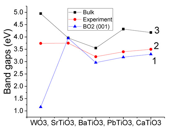 According to our B3LYP or B3PW calculations, the WO3, SrTiO3, BaTiO3, PbTiO3 and CaTiO3 bulk Γ–Γ band gap values (4.95, 3.96, 3.55, 4.32, 4.18 eV, respectively) were always reduced with respect to the bulk near the WO2- or TiO2-terminated WO3, SrTiO3, BaTiO3, PbTiO3 and CaTiO3 (001) surfaces (1.16, 3.95, 2.96, 3.18, 3.30 eV, respectively) (see Figure 5).