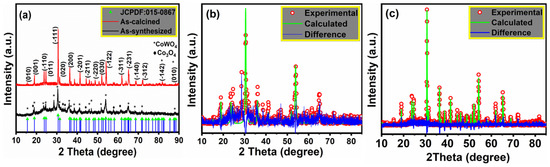 X-ray diffraction patterns of the as-synthesized and calcined powder along with their Rietveld refinements are shown in Figure 1a–c. Figure 1a shows the XRD pattern of both samples. We observed that the as-synthesized diffraction pattern showed several peaks and reflected the presence of the mixed-phase, CoWO4, and Co3O4 but no existence of NiO (Figure 1b). However, when it was calcined at 600 °C, peaks were suppressed and showed sharp crystalline planes in the as-calcined sample (Figure 1c). The intensity of nanoparticles increased after calcination. From this pattern, it can be indexed to the monoclinic phase with space group P2/a of the fabricated Ni-CoWO4, consistent with the JCPDS card no. 015-0867 [32]. The intensity of the peaks assigned to the phases demonstrates the dimensions (FWHM) of the Ni-CoWO4 nanostructures. Table 1 shows the lattice parameters and crystallite size of both samples. The crystallite sizes of both samples were calculated using the Debye–Scherrer equation [33].