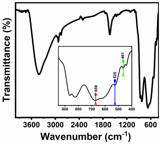 FTIR spectroscopic analysis was performed to examine the chemical bonds and functional groups in the materials. The spectrum of calcined NCW-NPs is depicted in Figure 2. A wide and shallow peak observed in the range of 3000–3420 cm−1 can be ascribed to the O–H stretching mode of adsorbed water molecules. The peak obtained at 2310 cm−1 was related to the CO2, whereas an intense peak was observed at 1632 cm−1 for the H–O–H molecule. The characteristic IR bands in the low-frequency region between 400–1000 cm−1 can be related to the Co–O, Ni–O, W–, and W–O–W bridges (Figure 2 inset). The two bands at 824 cm−1 and 659 cm−1 were recognized as the O–W–O vibration and W–O stretching mode, whereas the absorption peaks at 525 cm−1 and 461 cm−1 are related to the vibrational mode of the Co–O and Ni–O bonds, respectively [34,35,36,37].