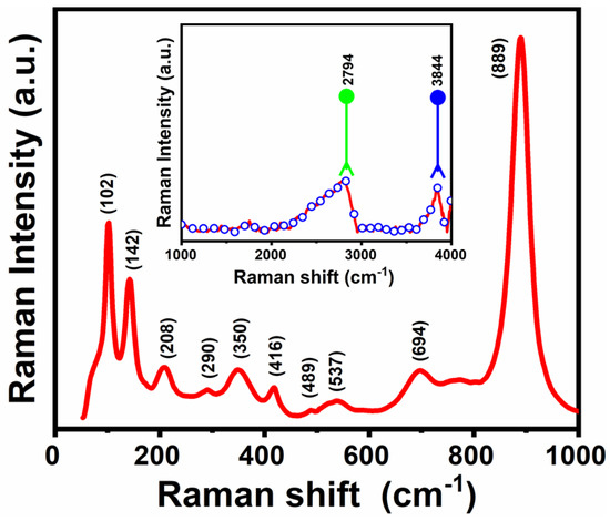 The calcined nanocrystal was characterized using a nondestructive Raman spectroscopy technique to understand the structural defects. Figure 3 shows the Raman spectrum for the fabricated NCW-NPs. The peaks appeared at 102, 142, 208, 290, 350, 416, 537, 694, and 889 cm−1 positions corresponding to the spectrum of bimetallic Ni-CoWO4 nanoparticles. The sharp band at 889 cm−1 was allocated to the symmetric mode of terminal W=O. The weak bands at 694 cm−1 and 537 cm−1 were antisymmetric and symmetric modes of O–W–O bridgings associated with tungstate anions. In-plane deformation and rotational mode of W–O bonds were observed at 416 cm−1 and 350 cm−1, respectively. The band at 102 cm−1 and 142 cm−1 was attributed to the lattice vibration. Weak bands at 208 and 290 cm−1 were associated with Ni–O and Co–O stretching, respectively. All Raman bands were in agreement with the reported results [31,38,39]. Two more band signals are shown at a higher wavenumber (Figure 3 inset) because of the presence of the hydroxyl group, agreeing with the IR results [39]. Thus, the fabricated bimetallic structured material exhibited a monoclinic phase and correlated with the X-ray diffraction pattern.