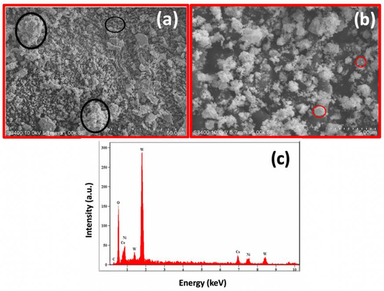 SEM images (a,b) with different magnification images and EDX spectrum (c) of Ni-CoWO4 NPs.