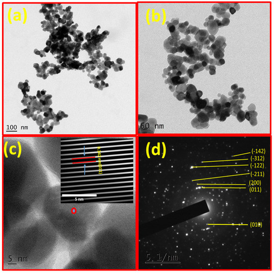 The morphology of the NCW-NPs with their crystalline character was analyzed using TEM and the SAED facility. Figure 5a,b shows the low and high magnification TEM images, which represent several spherical and monoclinic/cubic shaped NPs with smooth surfaces arranged on the whole surfaces, indicating that the nanoparticles were not in aggregated forms. This is because during sample preparation for TEM analysis, it was first sonicated for 10 min, appearing non-aggregated. By TEM analysis, it was confirmed that during sonication, the particle well separated because it showed no broken or rough surfaces. Some porous structures formed by the network of the interlinked nanoparticles were observed from these TEM images. The average size of each NP was in the range of 50–60 nm. The material crystallinity was confirmed from the HR-TEM (Figure 5c) and SAED (Figure 5d) patterns, which depict that the prepared material is highly crystalline with a lattice distance of ~0.342 nm, and can be recognized to the (011) plane in inset IFFT reflection of the red circle. The SAED patterns showed that the fabricated material is polycrystalline and inconsistent with the XRD, complimenting the characterization and formation of the Ni-CoWO4 nanoparticles.