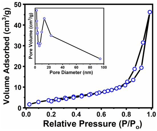 The BET surface area for the calcined polycrystalline was conducted to evaluate their area, volume, and pore-size distribution. Figure 6 shows the nitrogen adsorption–desorption isotherm at 77 K and the corresponding pore-size distribution curves of the fabricated nanoparticles. The BET isotherm was recognized as type IV isotherm and H2-type hysteresis, confirming the mesoporous structures [40]. The surface area was found to be 20.19 m2/g. The porosity of the NCW-NPs was determined from the desorption branch of the pore-size distribution curve (inset of Figure 6) and shows the sharp distribution in the mesoporous region. The average pore diameter and pore volume determined using the BJH method was found to be 2.22 nm and 0.075 cm3/g, respectively. Based on the analysis, it may be assumed that the formed nanoparticles exhibit good porosity, which is one of the key factors for photocatalytic degradation.
