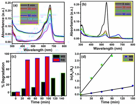 Absorption spectra of dyes at various time intervals under visible-light irradiation:(a) methylene blue, and (b) rose bengal dye. (c) Photocatalytic degradation of dyes and (d) kinetic relationship of ln(Ao/At) vs. irradiation time.