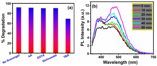 (a) Effects of different scavengers on degradation efficiency of RB and (b) photoluminescence spectrum against irradiation time.