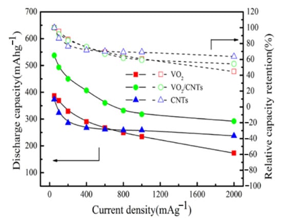 Comparison of the rate capacities and capacity retention of carbon nanotubes (CNTs), VO2, and VO2/CNTs (Adapted with permission from ref. [32]. Copyright 2018 Elsevier).