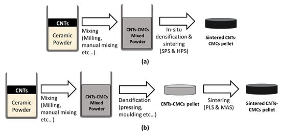 Powder processing is an established CNTs-CMCs fabrication technique for the production of near-neat shape products. This technique is also useful for its batch production and the integrated weight fractions of the raw material. Powder processing requires two or three steps. Figure 3 compares the two-step and three-step powder processing. The two-step powder processing involves the mixing of CNTs and ceramic powder, followed by in situ densification and sintering such as spark plasma sintering (SPS) and hot-press sintering (HPS), while the three-step processing involves mixing, densification, and sintering, such as pressureless sintering (PLS) and microwave-assisted sintering (MAS). Several techniques could be applied at the mixing process: manual mixing [62], planetary milling [63], ball milling [38,64,65], and high-energy ball milling [66]. The mixing is commonly performed using dry CNTs and ceramic powder, but it often requires a solvent like alcohol or acetone as a medium, known as wet-mixing, where the solvent is later evaporated. Removing the aggregation and achieving a homogenous CNTs distribution are the ultimate goals of this step. This processing technique is suitable for preparing CMCs with large amounts of CNTs, and it is applicable to the thermal enhancement [62,67] and mechanical enhancement [68,69] of CNTs-CMCs.