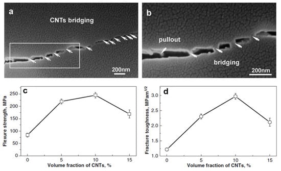 (a,b) Scanning electron microscope (SEM) micrograph of 10 vol.% CNTs-BAS composite upon indentation. The white arrows indicate the bridging effect of CNTs during the indentation crack propagation. (b) The enlarged micrograph from the white square section in (a), showing the CNTs pullout from the barium aluminosilicate (BAS) composite. (c,d) The flexural strength and fracture toughness peaked at the addition of 10 vol.% CNTs, which indirectly indicates that the practicable CNTs addition in the BAS composite is 10 vol.%. (Adapted with permission from ref. [70]. Copyright 2006 Elsevier).
