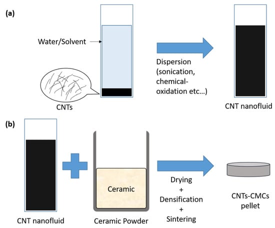 Colloidal processing involves several physical/chemical practices to disperse CNTs with water/solvent, eventually turning into CNT nanofluid. The options of the CNT dispersant are limited because it needs to meet the dispersion compatibility and the sinterability upon the densification and sintering with the ceramic domain. Critical dispersion steps, such as sonication, magnetic stirring, and chemical oxidation, are taken for the CNTs nanofluid production. The CNT nanofluid is added to the ceramic powder and densified for the final CNTs-CMCs product. Figure 5 displays the schematic of colloidal processing.