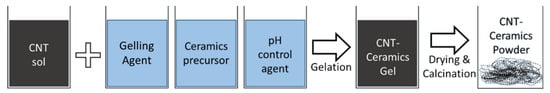 Sol–gel processing techniques are effective for fabricating CNTs-CMCs with a homogenous CNT dispersion and a uniform size distribution of ceramic crystals. CNTs are sonicated in an aqueous solution (or solvent) with minimum surfactant addition (known as the CNT sol). In order to prepare CNTs-CMCs gel, a series of solutions (ceramic precursor, gelling agent, and pH control agent) are added into the CNT sol, and ageing or the gelation process is carried out. The CNTs-ceramic gel is then dried, calcined at high temperature with (without) inert gas, and left with the CNTs-ceramic powder (see Figure 6).