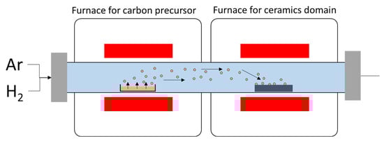 In situ synthesis is the attempt for CNTs-CMCs to grow CNTs on the ceramic matrix directly, and it is widely performed through chemical vapour deposition (CVD). Generally, the ceramic powder is prepared with metal salt (such as metal nitrate or acetate salt) in an aqueous solution or solvent to ensure complete metal ion impregnation within the ceramic domain. Next, the ceramic-metal solution is reduced at high temperature with the presence of H2 as the metal salt reduces to metal oxides and further reduces to metal nanoparticles. The nanoparticles act as the active growth site for CNTs, so the carbon solubility is critical. The commonly used transition metal catalysts are Fe, Ni, and Co for their moderate-to-high carbon solubility at elevated temperatures. Carbon atoms for the CNTs growth come from the carbon precursor (CH4, C2H2, ethanol, etc.) and are carried by the flowing gas (such as Ar, N2, He) within the CVD system (see Figure 7). The deposition of carbon atoms (carbonaceous molecule from the carbon precursor) involves several mechanisms: carbon adsorption on the catalyst surface, the dissolution of carbon molecules (segregation of hydrogen bonding), carbon diffusion into the catalyst, the formation of the carbon network and the growth of CNTs. Table 3 displays the optimum parameters for in situ CNTs growth on ceramic.