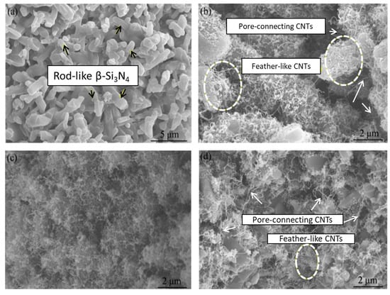Scanning electron microscope (SEM) images and fracture surface images of (a) neat Si3N4, (b) 2 wt.% CoAc, (c) 4 wt.% CoAc, and (d) 10 wt.% CoAc. The resulting CNTs contents are 0, 1.49, 1.97, and 2.70 wt.%, respectively. (Adapted with permission from ref. [102]. Copyright 2015 Elsevier.)