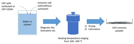 Hydrothermal and solvothermal processes are well-established CNTs-CMCs techniques for homogenous CNT dispersions with a low number of impurities. Generally, acid-functionalized CNTs are dispersed in water (hydrothermal) or solvent (solvothermal), together with the ceramic salt with (without) the surfactant. The surfactant reduces the interfacial resistance among the ceramic salt, CNTs, and the dispersion medium. The aqueous mixture of CNTs and salt is magnetically stirred or sonicated for CNTs disentanglement and to improve the CNTs-CMCs homogeneity. Next, the mixture is stored in an autoclave and heated from 100 to 250 °C for several hours to several days, highly dependent on the crystallization of the domain ceramic (Figure 9).