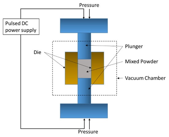 Spark plasma sintering (SPS) schematic setup.