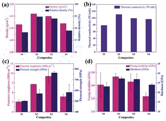 The properties of CNS-reinforced Si3N4/SiC CMCs: (a) bulk and relative densities, (b) thermal conductivity, (c) fracture toughness and flexural strength, and (d) Young’s modulus and hardness. The composites are labelled as S1 (CNS-free composites), S2 (CNF-CMCs), S3 (MWCNTs-CMCs), and S4 (GNP-CMCs). (Reprinted from ref. [127]).