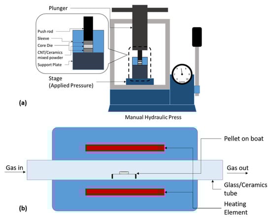 Pressureless sintering (PLS) differs from pressure-assisted sintering during the thermal treatment. For pressure-assisted sintering (such as SPS and HPS), the densification process of CNTs-CMCs powder takes place in the furnace during the sintering process. For the PLS route, the CNTs-CMCs mixed powder is uniaxially pressed to pellets before the sintering, with a manual hydraulic press or other pelleting apparatus. Next, the pellet is placed in an electrical/tubular furnace and fired to form the final product. Only during the specific temperature firing/sintering, the high energy breaks the strong covalent and ionic bonding within the ceramics and opens a path for the vacancy diffusion mechanism [128]. The gas type/flow is optional and greatly dependent on the thermal stability and purity of CNTs at different elevating temperatures. The schematic setup is displayed in Figure 13.