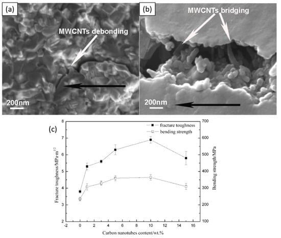 Ye et al., improved the KIC and flexural strength of barium aluminosilicate (BAS) glass–ceramic composites by adding MWCNTs through wet powder processing [70]. They sonicated and ball-milled the MWCNTs-BAS in ethanol into the MWCNTs-BAS slurry. Next, the slurry was dried and hot-pressed (1600 °C, 1 h, 20 MPa, N2 atmosphere) into ceramic pellets for mechanical analysis. They noticed that the addition of 10 vol.% MWCNTs increased the flexural strength from 84 to 245 MPa (about 300%) and the KIC increased from 1.22 to 2.97 MPa·m1/2. Good MWCNTs-BAS interfacial bonding, the high elastic modulus of CNTs, and the CNTs bridging contributed to the enhanced mechanical properties. By contrast, the relative density of 15 vol.% CNTs-added composites decreased by 3% and the flexural strength only achieved 169 MPa, which was due to the effect of the agglomerated CNTs (see Figure 4). Moreover, Chan et al. reduced the lattice strain of zinc silicate CMCs upon the addition of CNTs [71]. They prepared CNTs through CVD on a cobalt oxide metal catalyst and through the manual mixing of the CNTs with zinc silicate glass powder. The CNTs-zinc silicate glass powder was further sintered in Ar atmosphere, and the zinc-silicate glassy phase changed to the polycrystalline willemite phase (Zn2SiO4). Through the phase analysis, CNTs showed an insignificant phase alteration to the domain Zn2SiO4 crystal structure but only introduced the graphite (C) and cobalt oxide (CoO) phases. They also noticed that the lattice strain of 3 wt.% CNTs-Zn2SiO4 reduced by 22.85% and the crystallite size of 1 wt.% CNTs-Zn2SiO4 CMC increased by 5.65%, as compared to the CNTs-free Zn2SiO4 composite.