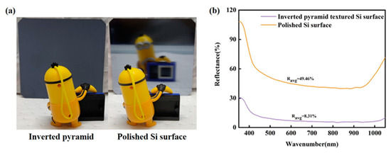 As shown in Figure 1, etching results exhibited two completely different phenomena-fabrication of inverted pyramid or polishing. The object mirroring was completely invisible due to the existence of the inverted pyramid light-trapping structure on the Si surface; a clear object outline appeared on the polished Si surface (Figure 1a). Correspondingly, inverted pyramid textured prepared by Ag@PVP–ACE exhibited low reflectivity, the average reflectivity reached 8.31%, and the average reflectivity of Si surface polished by Ag@PVP–ACE reached 49.46%.