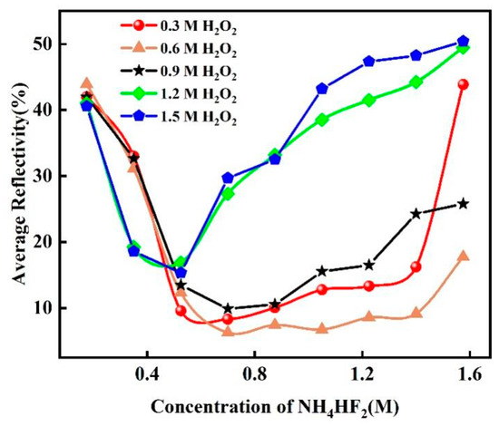 Dependence of samples surfaces average reflectivity on the concentration of H2O2 and NH4HF2 in mixed solution with 94 mM AgNO3 and 9 × 10–7 M PVP. All experiments were performed at 65 °C for 20 min.