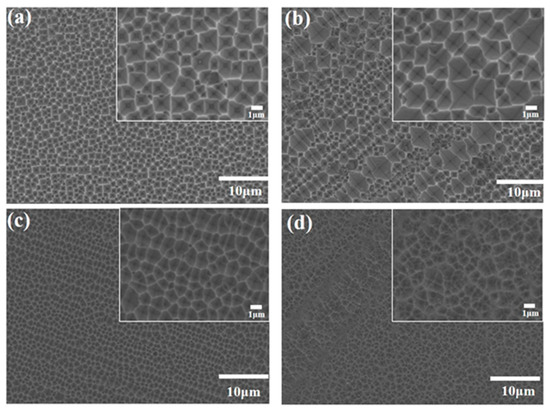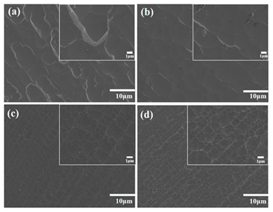 Figure 4 shows the corresponding SEM images of samples etched by Ag@PVP–ACE with different H2O2 concentrations under 0.175 M NH4HF2. When the H2O2 concentration was 0.3 M, some large-sized shallow square grooves appeared on the Si surface, and the overall morphology was relatively flat (Figure 4a). The surface morphology became flatter when the concentration of H2O2 was 0.6 M (Figure 4b). However, the difference was that the shallow round groove was generated when H2O2 concentration increased to 1.2–1.5 M (Figure 4c,d). The process of transforming square groove to round groove means that anisotropy of the etching process was weakened as NH4HF2 concentration increased.