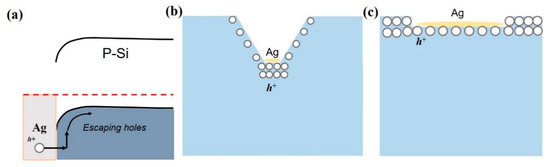 As for p-type Si, it was difficult to confine the holes under the Ag/Si contact interface. The holes would drift away from the p-type Si surface via the effect of the interface catalytic electric field (Figure 5a). Thus, the hole distribution density of different parts of the Si was obviously different. An anisotropy etching process of MACE occurred [27] (Figure 5b). With the increase of H2O2 concentration, ultra-high H2O2 concentration would inject additional holes into the Si valance band. The difference of holes distribution density reduced. As a result, anisotropic etching was weakened. By contrast, the isotropic etching process enhanced, the transformation of the square groove to round groove occurred via the etching behavior of Ag@PVP–ACE changes (Figure 5c).